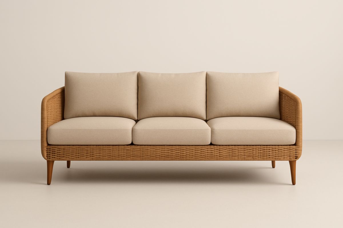 Divano 3 Posti in Rattan Sintetico e Tessuto Beige